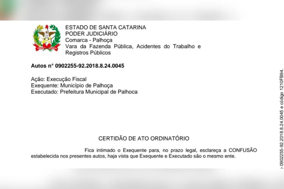 O município aparece como credor e devedor em uma execução fiscal de R$ 100,9 mil.